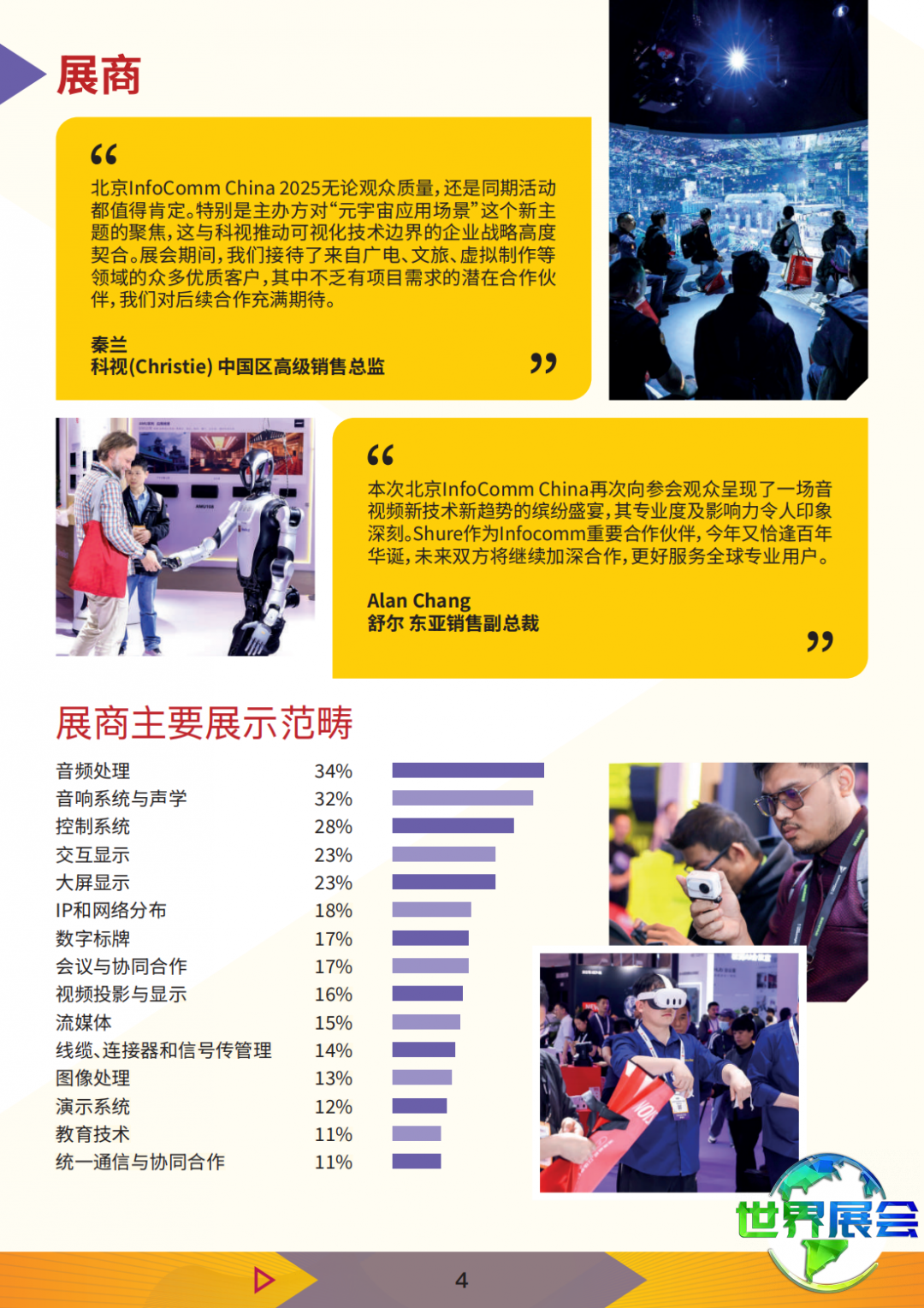 3D技术、音响设备、功率放大器与调音台、音频科技、视听科技、计算机、信息技术、指挥控制系统、控制台、传输系统与技术、显示设备与技术、电子白板、黑板及电子定位系统、家庭网络与自动化、家庭影院技术、多媒体、投影机镜头及配件、演讲与培训工具、信息发布与服务、支架及悬挂系统、信号管理与处理、模拟系统、流媒体及网络播送系统、视频制作与编辑技术、无线影音系统
