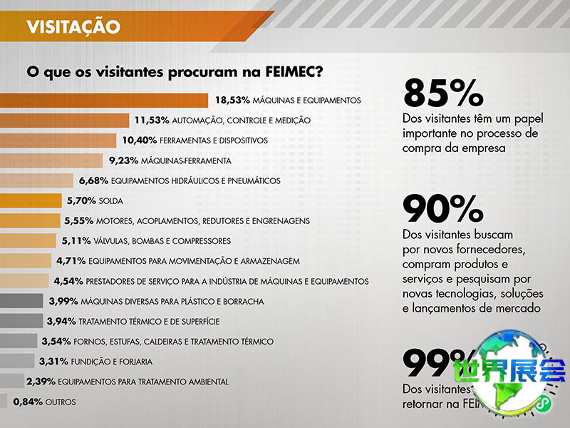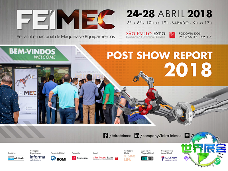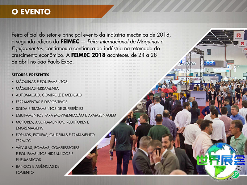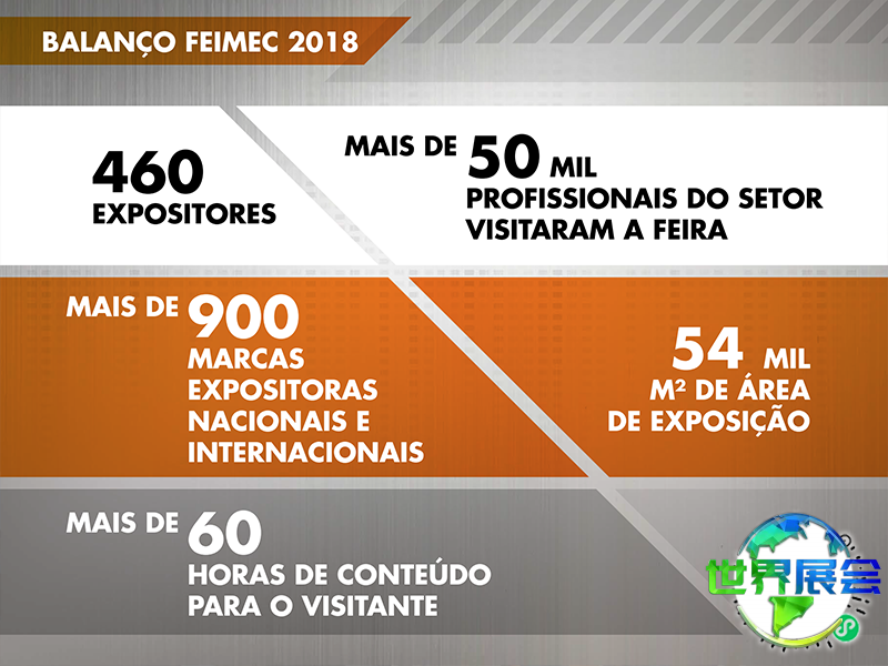 上届巴西圣保罗工业博览会(FEIMEC)展出总面积达60000平方米,吸引了来自中国、中国台湾、意大利、南非、西班牙、智利、美国、墨西哥、澳大利亚、加拿大等地的850家企业参展,参观者数量达到59000人次。