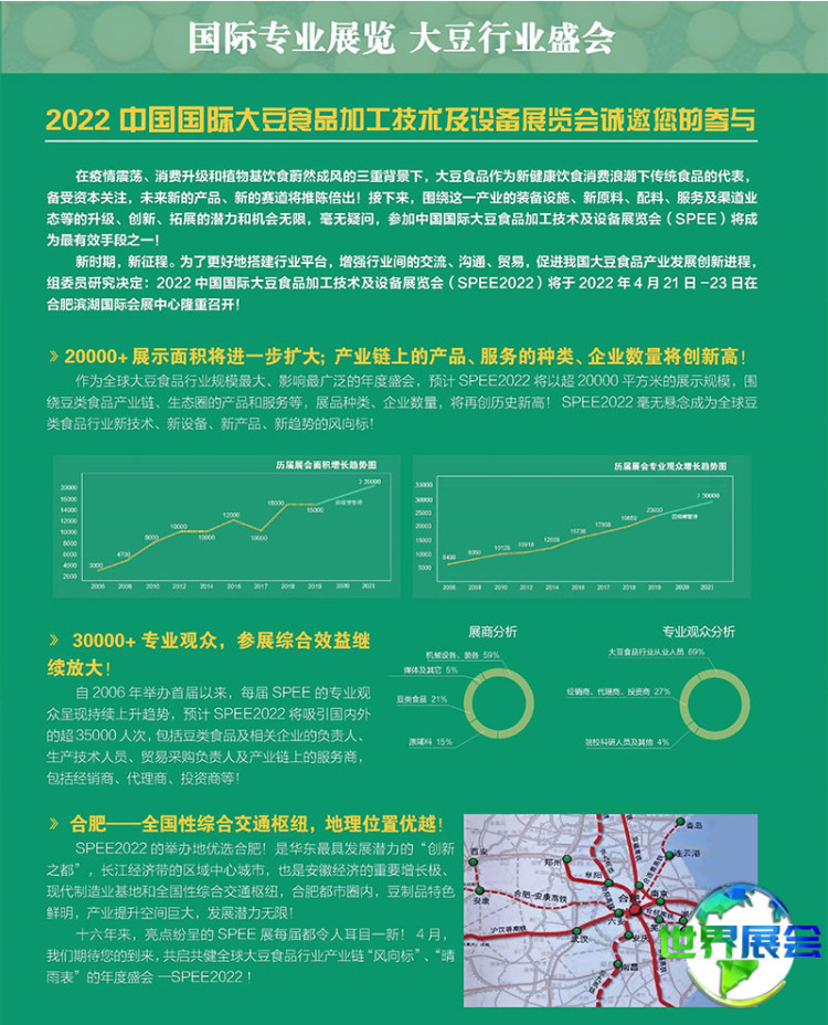 中豆展——中国合肥大豆食品、豆制品加工设备展(SPEE)是豆制品全产业链年度规模最大的行业盛会。它也是大豆及植物蛋白产业链从业者解决发展难题、把握市场趋势的高效平台。本届中豆展SPEE的展览面积将达到25000平方米,围绕大豆及植物蛋白产业链的产品与服务展品类别、参展企业数量,预计也将刷新历史纪录。