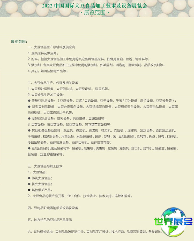 大豆食品生产、包装及相关机械:大豆预处理机械:大豆筛选机、大豆脱皮机、洗豆机等;大豆食品生产加工设备:传统豆制品设备(豆腐设备、豆浆/豆奶设备、豆干设备、千张/百叶设备、腐竹设备、豆芽设备等);新型豆制品设备:大豆分离蛋白设备、大豆浓缩蛋白设备、大豆组织蛋白设备、大豆蛋白肽设备、大豆蛋白成型机、大豆蛋白渣烘干机等;发酵豆制品设备:腐乳设备、纳豆设备、豆豉设备等;其他相关设备及器具:泡豆机、煮浆机、磨浆机、筛浆机、均质机 、压榨机、油炸设备、食用油过滤机、干燥设备、换热器设备、灭菌设备、水处理设备、锅炉、砂轮、泵、豆制品模具、周转箱、托盘、包布、打码机、冷链运输设备等;豆制品包装机械及包装材料:包装机、制袋机、洗袋机、盒装机、灌装机、封口机、封箱机、包装盒、包装袋、包装膜等