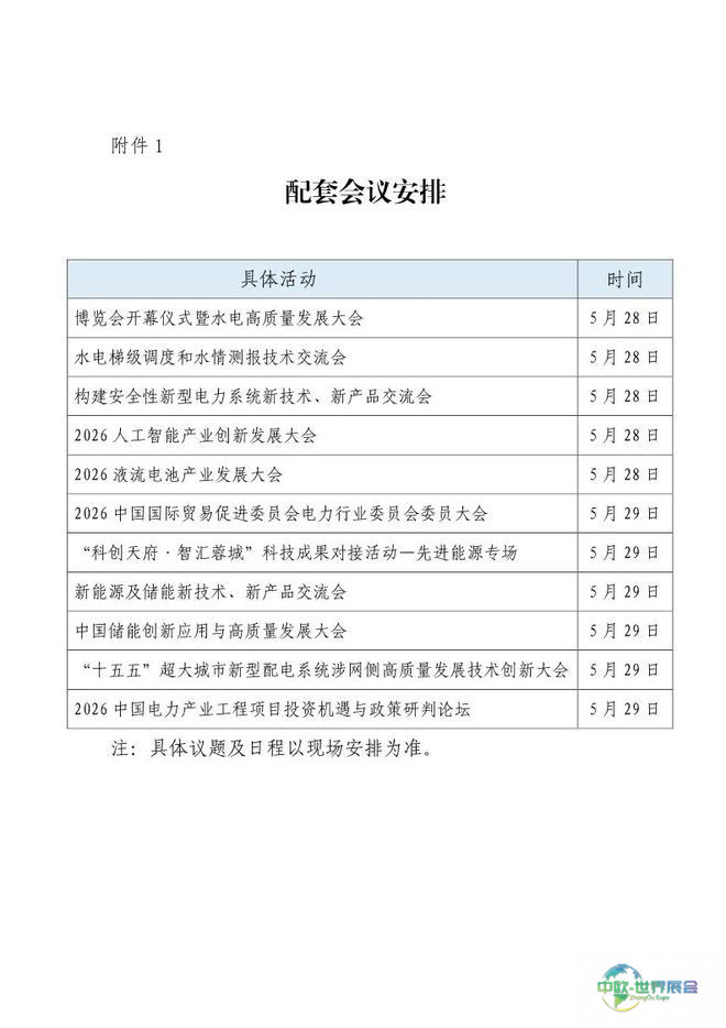 展会期间,将同步举办博览会开幕式暨水电高质量发展大会、水电梯级调度与水情测报技术交流会、中国储能创新应用与高质量发展大会、2026液流电池产业发展大会、“十五五”超大城市新型配电系统涉网侧高质量发展技术创新大会等10余场专题会议及配套活动,具体安排详见附件1。