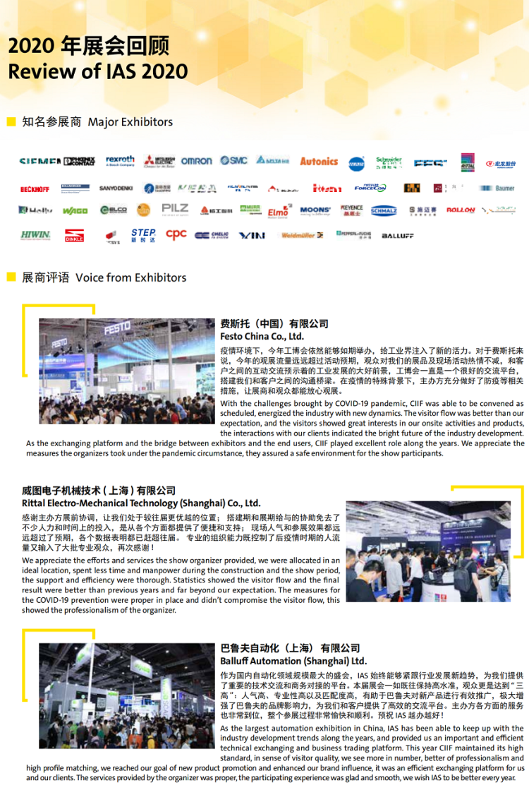 知名参展企业:西门子、菲尼克斯、三菱电机、博世、欧姆龙、台达电子、图尔克、SMC、费斯托、泰科、倍福、贝加莱、研华、固高科技、英威腾、汇川、欧瑞传动、威强电等行业标杆级企业,境外展商比例超过60%,使IAS成为自动化行业名副其实的亚洲第一展。