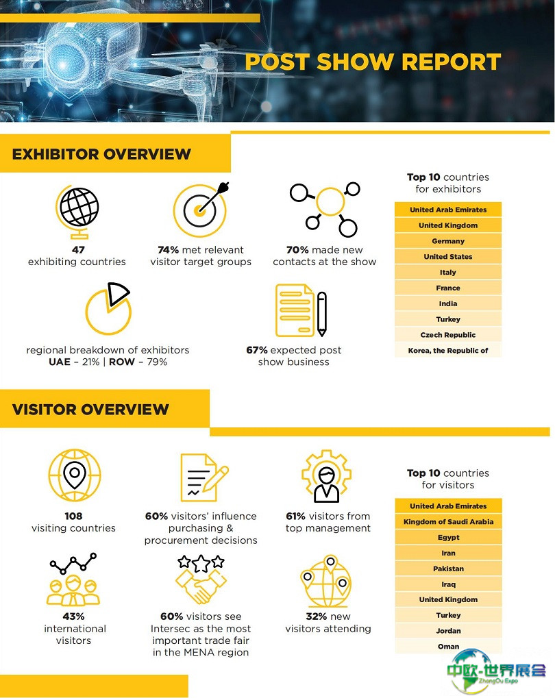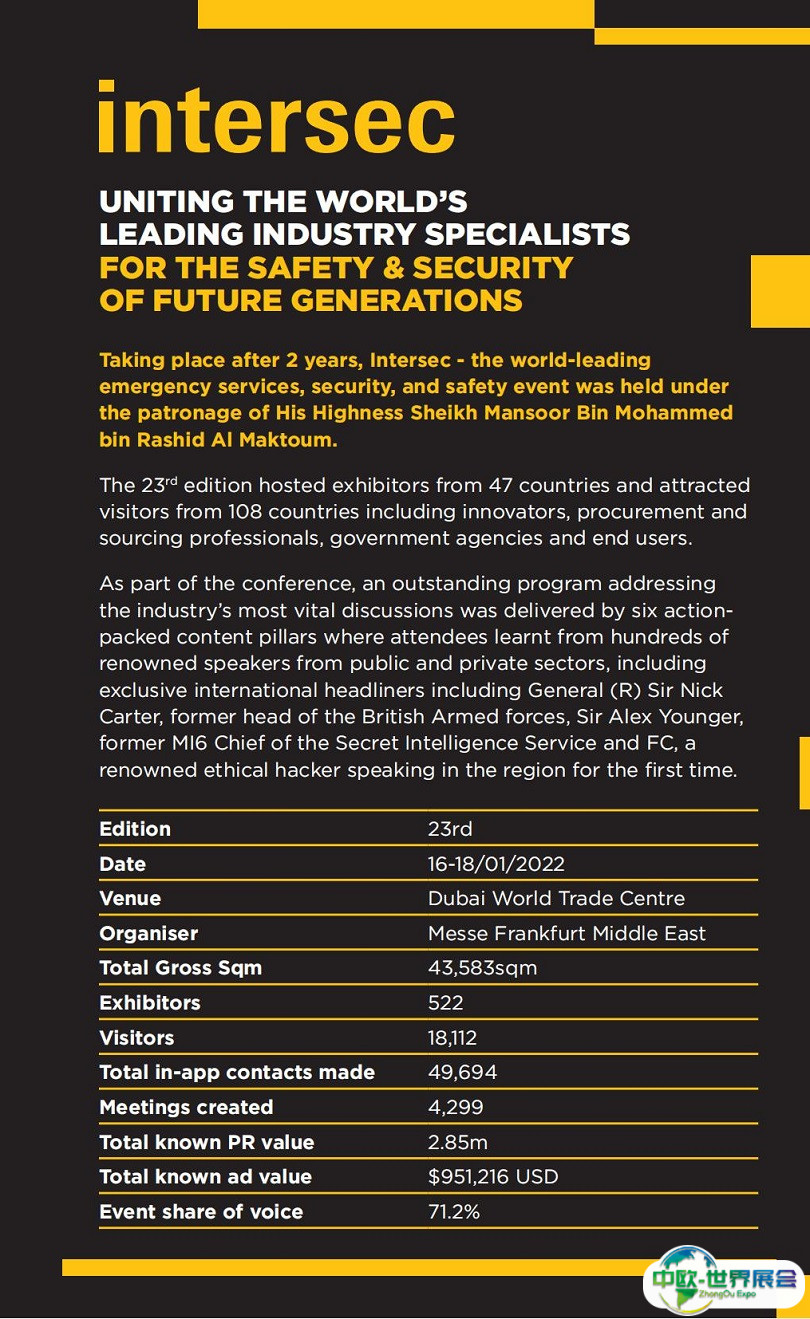 中东迪拜安防及消防展览会(Intersec DUBAI)上届展会总面积90000平方米,参展企业1235家均来自中国、中国台湾、日本、土耳其、沙特阿拉伯、南非、德国等,参展人数达47000人。